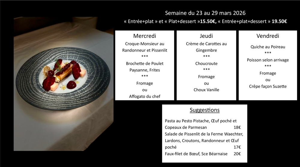 Savourez une véritable tarte flambée au feu de bois ou notre formule Plat du jour à 19,50 € servie le midi en semaine.
